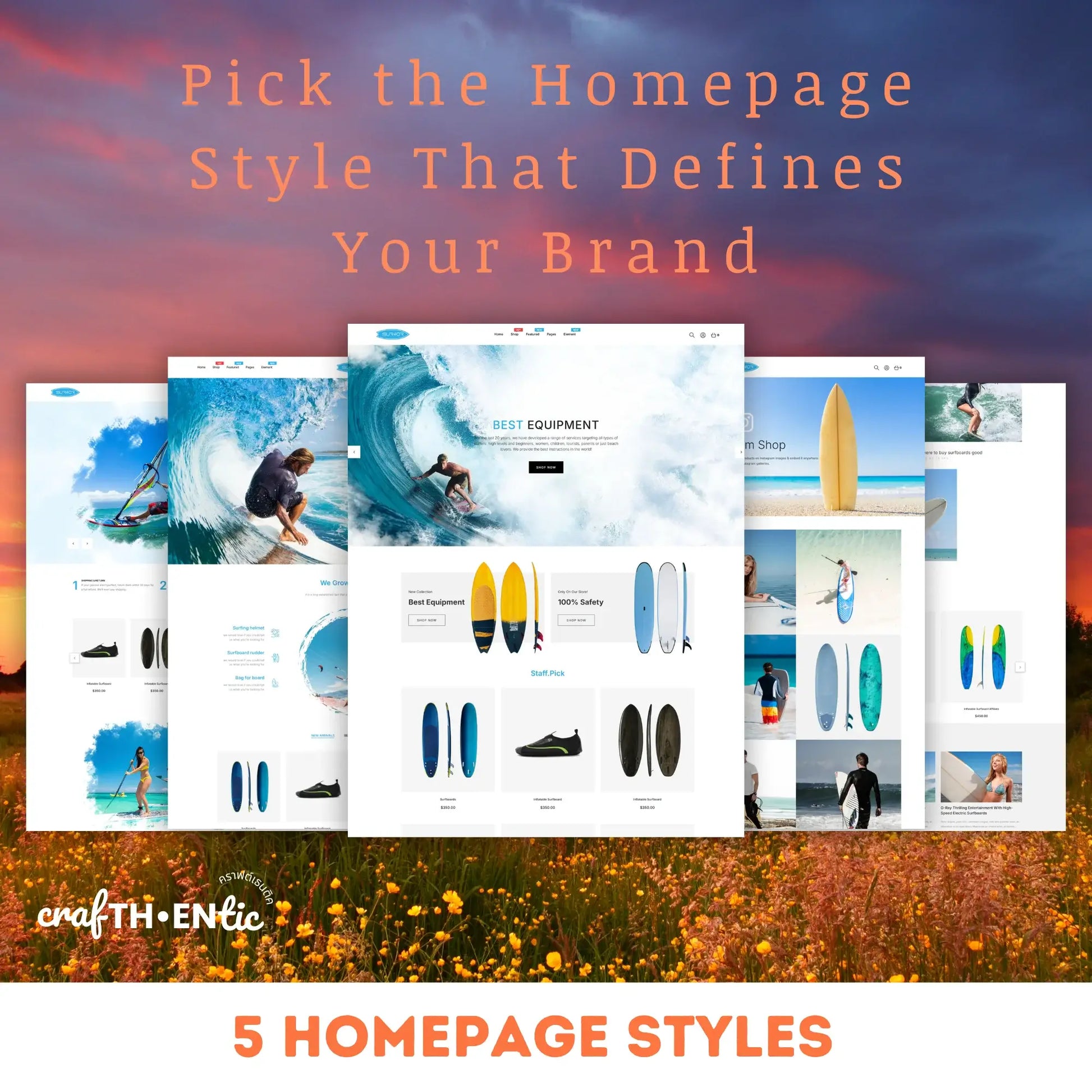 🌴 5 Dynamic Homepage Styles – Pick from a variety of vibrant, beach-inspired layouts to showcase your surf products and brand story.
